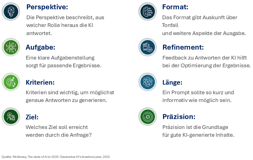 ![]() | 5. Präzision | Wie detailliert muss die Antwort sein? | Vermeidet vage Antworten: Gib der KI exakte Toleranzen und Kennzahlen vor. |